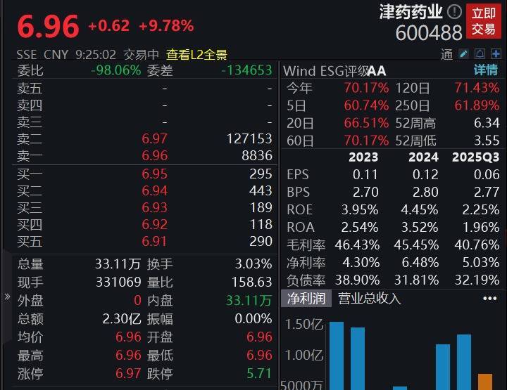 津药药业大幅高开超9%,公告称,公司研发以仿制药为主,无在研创新药项目。